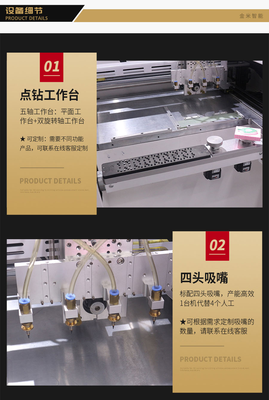 全自動五軸點鉆機,是金米智能專門用于解決珠寶首飾鑲鉆效率低而研發的產品。可用于戒指、吊墜、耳飾、胸針、手表等各種帶鉆的珠寶飾品。五軸聯動多功能,平面、圓弧、立體多維面自動。定位精準,效率高,1機最多可頂替8個人工,1小時可點9000顆鉆(4頭吸嘴真實測試數據)。10.4寸中文觸屏操作系統,傻瓜式操作,簡單易學。 可試機打樣!
