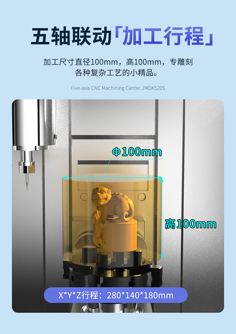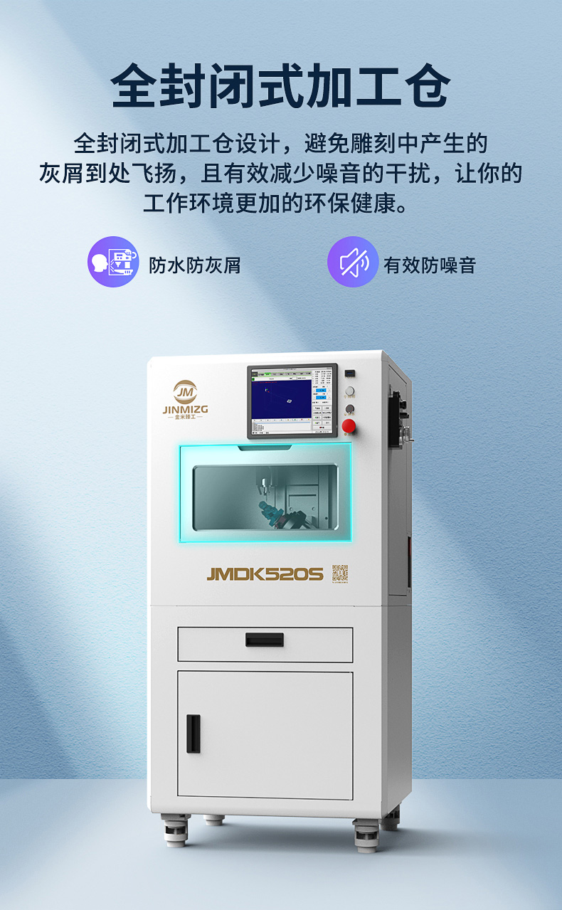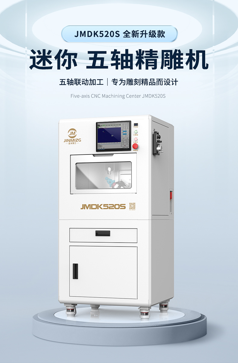 1、JMDK52s0是一款專用于雕刻精品的小型五軸雕刻機(jī)。2、五軸聯(lián)動(dòng)技術(shù),可滿足不同加工需求,鏤空雕刻、砵體掏空、弧面雕刻、不規(guī)則體雕刻等。比如一些立體手把件、立體擺件、神獸擺件、精品印章、佛像雕刻等。3、搖擺式雕刻工作臺(tái),C軸360度旋轉(zhuǎn),B軸145度擺動(dòng)。4、迷你機(jī)身設(shè)計(jì),體積如同一臺(tái)小冰箱,可進(jìn)家門,可進(jìn)電梯。5、移動(dòng)更加的方便。全封閉式加工倉設(shè)計(jì),更加的靜音環(huán)保。6、操作系統(tǒng)采用五軸智能觸控屏,10.4寸觸控屏,操作更靈活,更加直觀的操作方式。7、適合雕刻材料:玉石翡翠、銅、鋁、木材、人造材料等。
