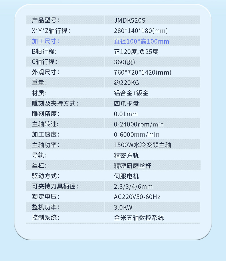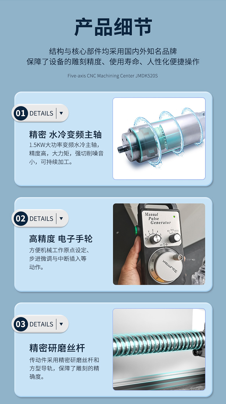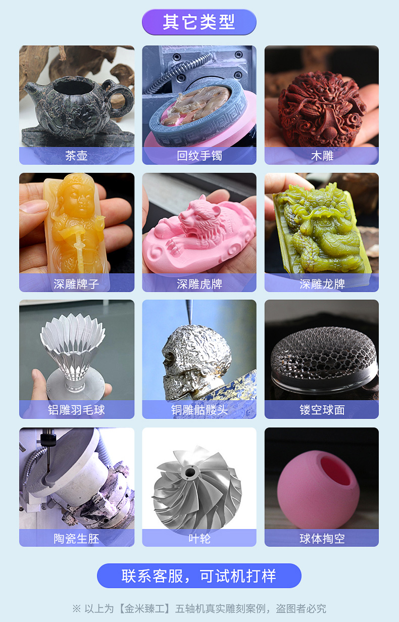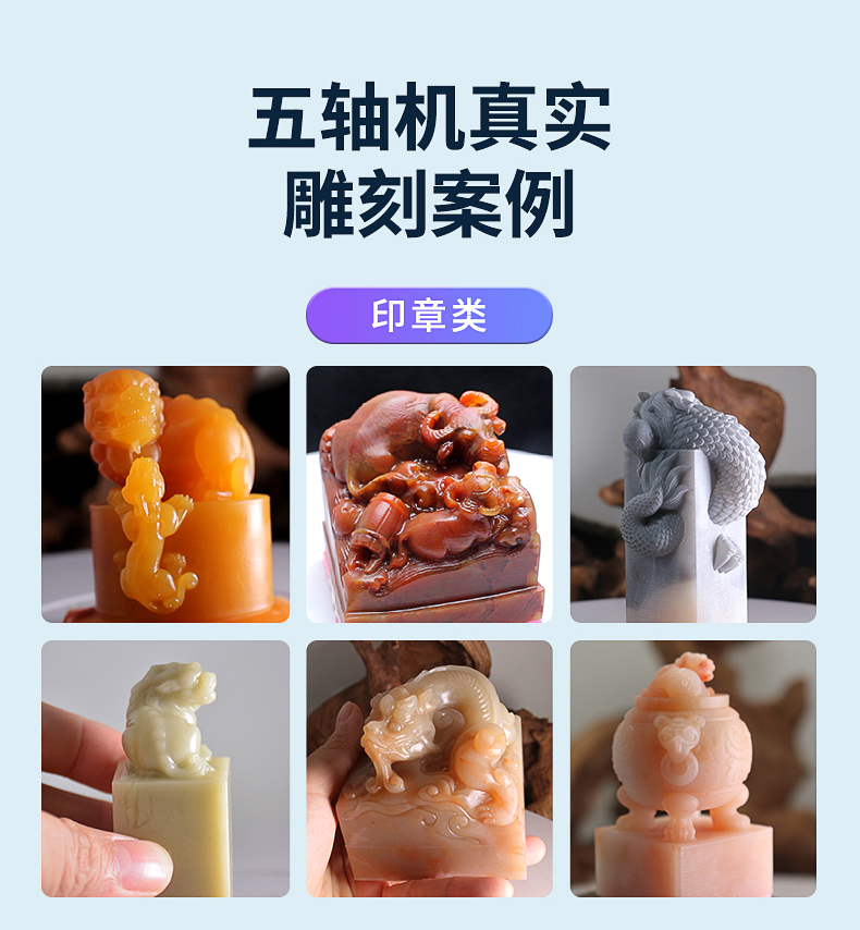 1、JMDK52s0是一款專用于雕刻精品的小型五軸雕刻機(jī)。2、五軸聯(lián)動(dòng)技術(shù),可滿足不同加工需求,鏤空雕刻、砵體掏空、弧面雕刻、不規(guī)則體雕刻等。比如一些立體手把件、立體擺件、神獸擺件、精品印章、佛像雕刻等。3、搖擺式雕刻工作臺(tái),C軸360度旋轉(zhuǎn),B軸145度擺動(dòng)。4、迷你機(jī)身設(shè)計(jì),體積如同一臺(tái)小冰箱,可進(jìn)家門,可進(jìn)電梯。5、移動(dòng)更加的方便。全封閉式加工倉設(shè)計(jì),更加的靜音環(huán)保。6、操作系統(tǒng)采用五軸智能觸控屏,10.4寸觸控屏,操作更靈活,更加直觀的操作方式。7、適合雕刻材料:玉石翡翠、銅、鋁、木材、人造材料等。