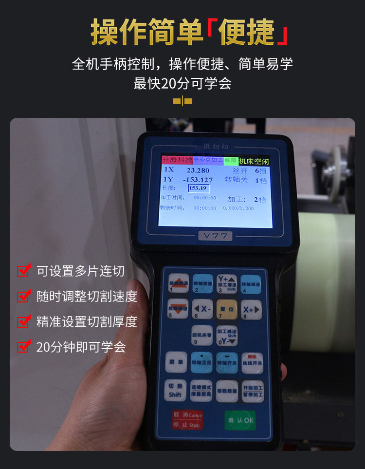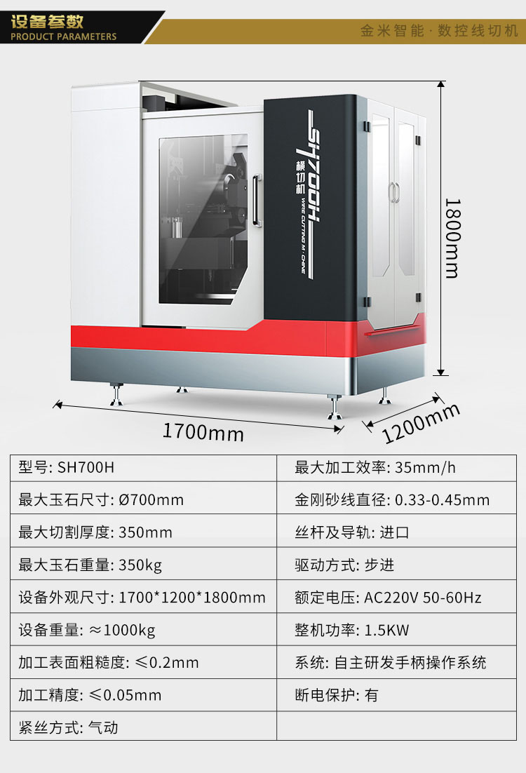 SH700H是一款采用金剛砂線往復(fù)走絲的自動精準(zhǔn)切割的線切割機。適合切割:高硬度的翡翠、玉石、寶石、莫桑鉆、玻璃、陶瓷、大理石、環(huán)氧板、鐵氧體、碳化硅、頁巖石、木頭、人工材料等切片。應(yīng)用領(lǐng)域:玉石加工廠、工藝品加工廠、寶石行業(yè)加工、工業(yè)原料切割等。